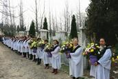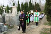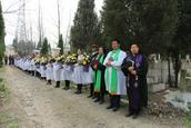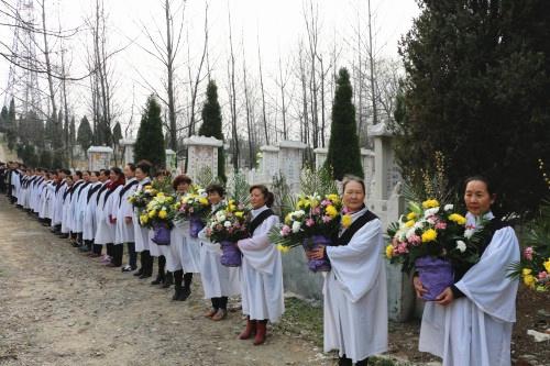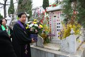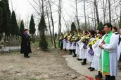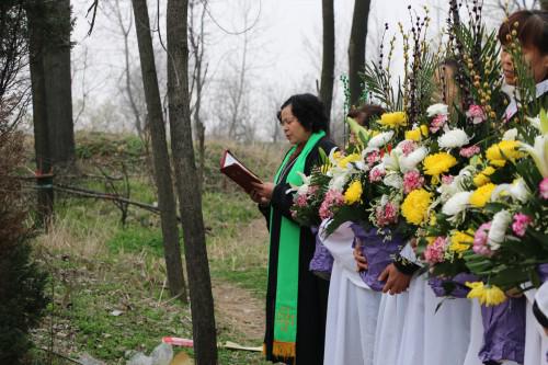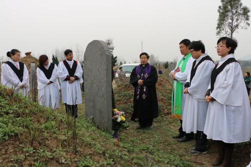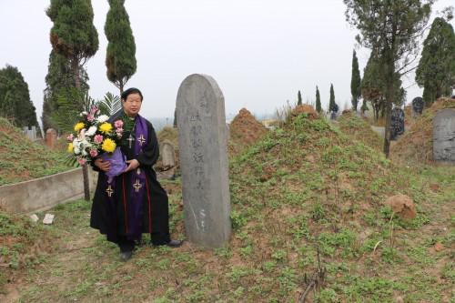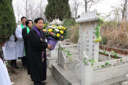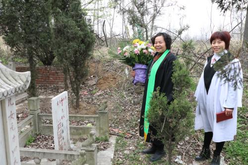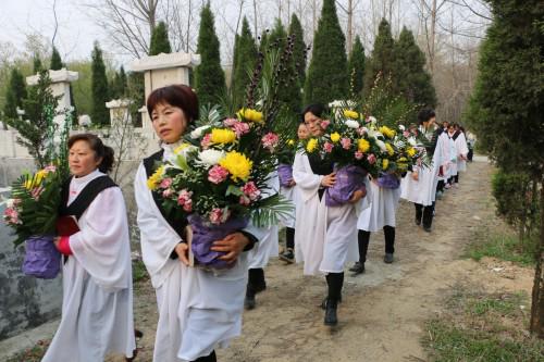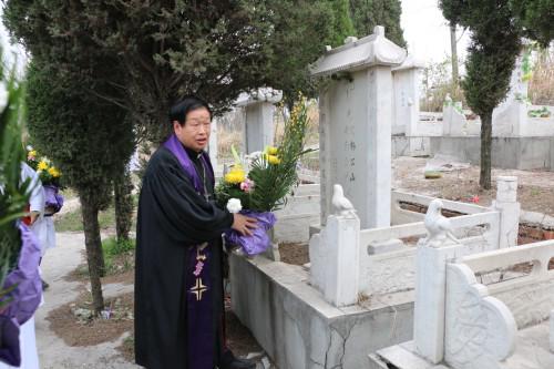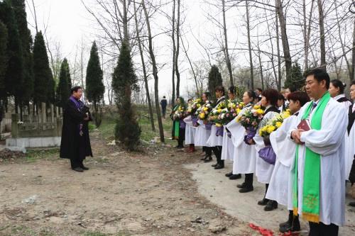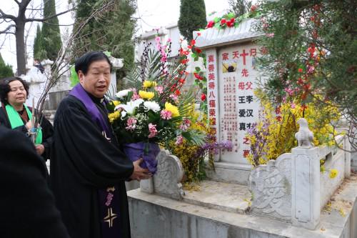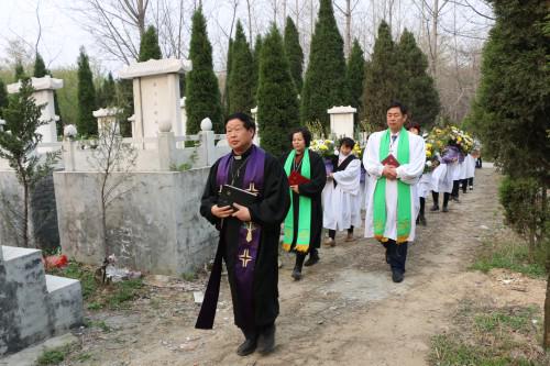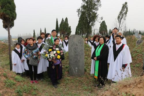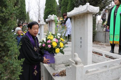 2016年3月23日上午,河南省基督教两会副会长、驻马店市驿城区基督教两会主席会长白建德牧师带领教牧同工和圣诗班的弟兄姊妹一行80多人,来到驻马店市香山葡萄架教会公墓为安息主怀的焦世清长老、范家富长老、王爱真长老、苏天兴执事及200多位息劳归主的弟兄姊妹复活节扫墓,并举行追思记念。
