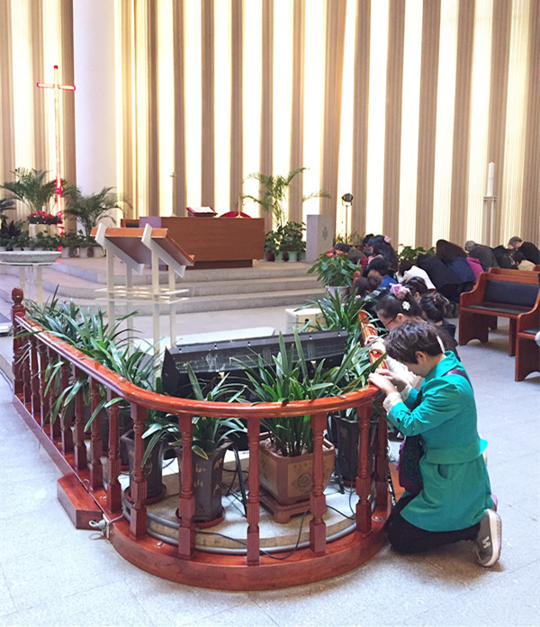 4月17上午,北京海淀堂第三场礼拜结束之后,近20名会众跪在讲台前祷告。笔者发现在海淀堂的讲台前有预先铺好的垫子,方便信徒在此祷告。