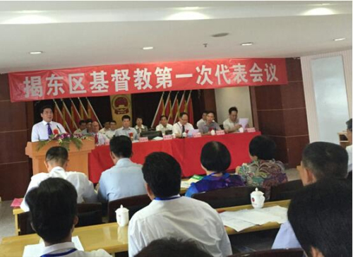2016年5月18日上午,广东省揭阳市揭东区基督教两会召开第一次代表大会,此次会议在市区华南大酒店召开。广东省两会领导樊宏恩牧师、雷玉明牧师、揭阳市两会主席会长许洁平牧师以及揭东区统战部副部长、民族宗教局局长曾育群等莅临会议。