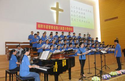 图:揭阳基督教网站6月23日晚,广东揭阳基督教两会在市区东山堂举行第八届夏令赞美会,赞美会持续近2个小时,真光合唱团参加并献唱。