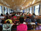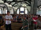 张雅凤牧师带领会众读经哥林多前书1章17-31节,会众诵读使徒信经并唱诗后,宣讲会进入证道环节。