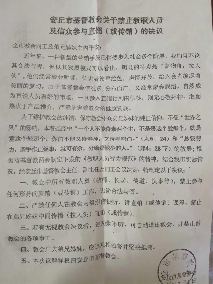 7月1日,山东省安丘市基督教会向中心堂及40多个堂点发出一份决议公告:禁止教职人员及信众参与直销(或传销)。安丘市教会的韩玉萍长老告诉福音时报,安丘教会很少发布通告,上一次大的通告是关于“东方闪电”。