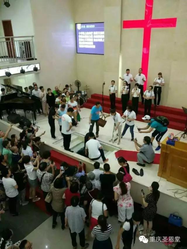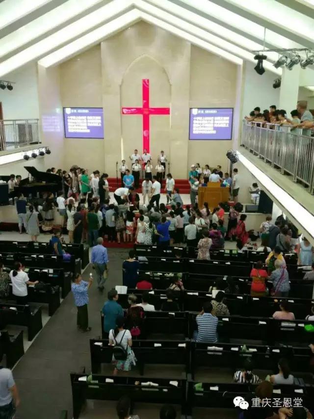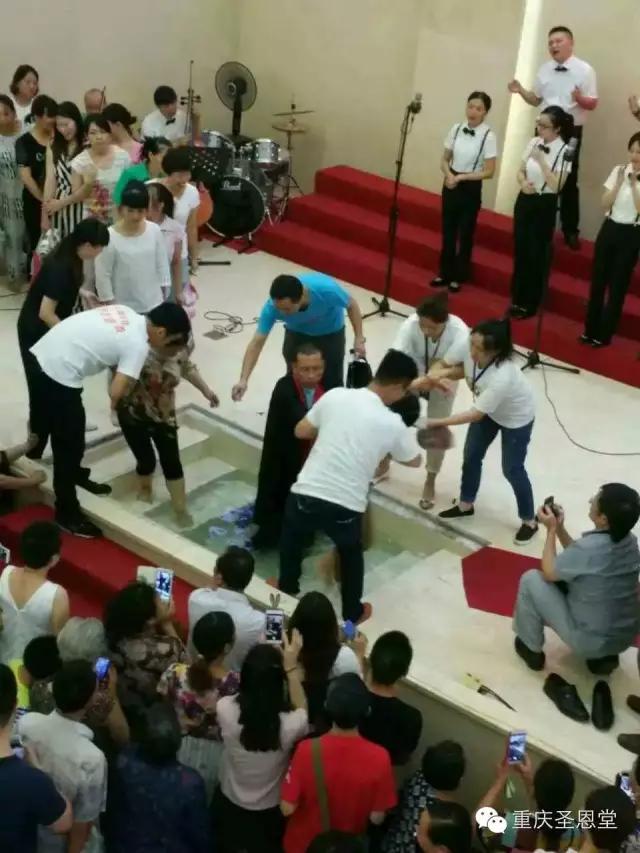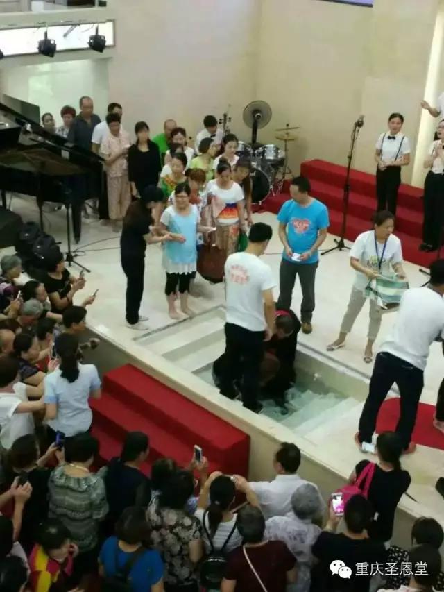 重庆圣恩堂微信消息,7月24日,重庆市基督教圣恩堂主日礼拜证道之后,教会为新信徒进行浸水受洗仪式,42人受洗(见上图)。