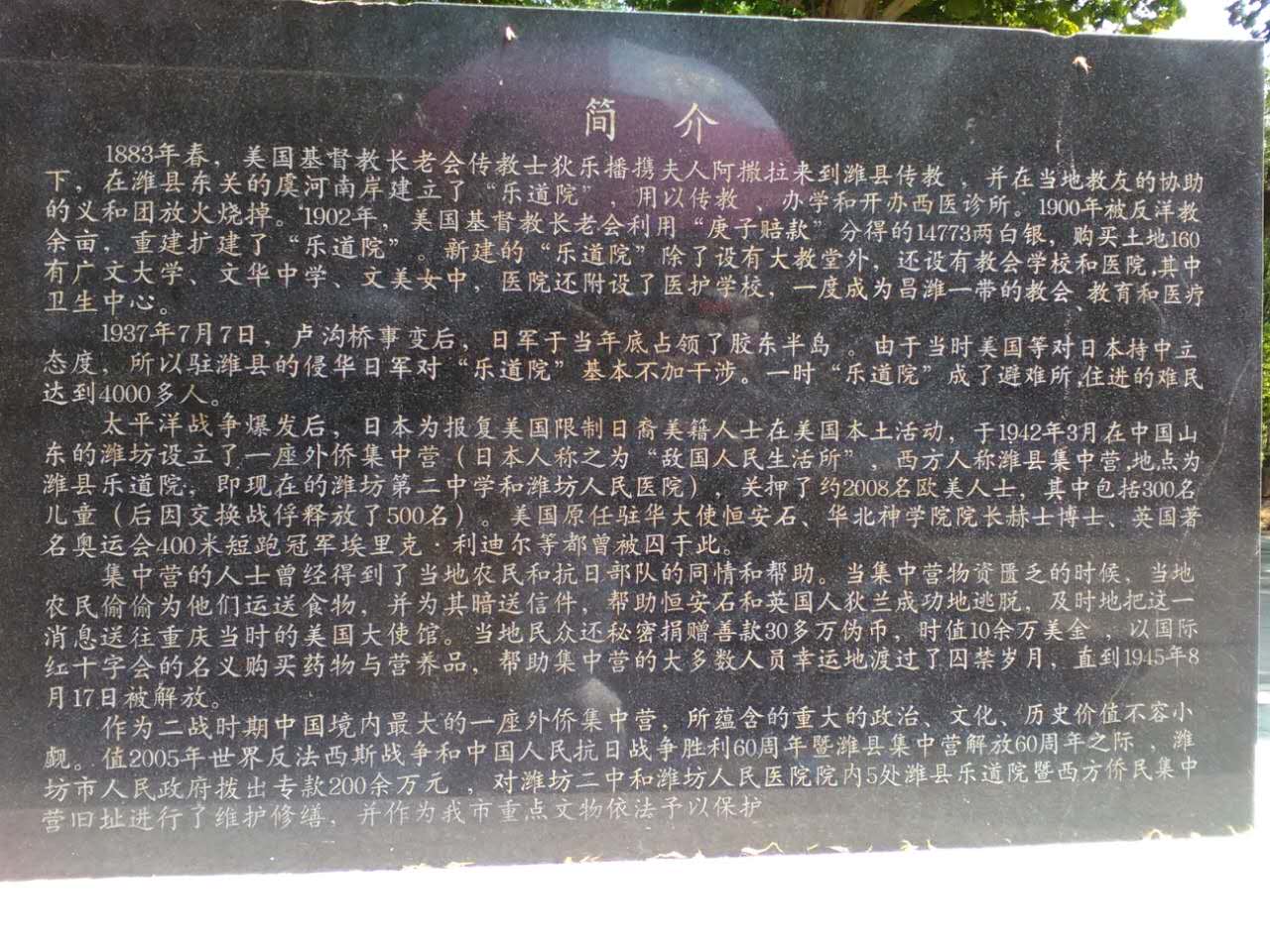 1937年七月七日,卢沟桥事变后,日军于当年底占领了胶东半岛,由于当时美国等对日本持中立态度,所以驻维县的侵华日军对“乐道院”基本不加干涉。院内的传教,教学,和医务活动尚能正常开展。到1941年12月7日,日军偷袭珍珠港,美英正式对日宣战,太平洋战争爆发,美英等国和日本成了敌对国,由于美日之间的关系,日本为报复美国,将中国沦陷区内的美国,英国,和其他反法西斯国家的人士强行收管。因维县靠近胶济铁路,交通比较方便,又加上维县乐道院场地较大,因此被日军强行霸占,将次办成监狱式集中营,在战争时期,“乐道院”一时之间成了避难所,难民达到4000多人,关押时间长达三年之久。战争中总共关押侨民,2008人,其中儿童327名。他们为福音来到中国,也把生命留在了中国。他们分别来自,美国,英国,加拿大,澳大利亚,新西兰,荷兰,比利时,伊朗,菲律宾,古巴,希腊,挪威,乌拉圭,和巴勒斯坦,其中以欧美人士居多。“乐道院”,一时成了难民集中营,面对蜂拥而至的难民,生活用品,医药变的非常紧张。