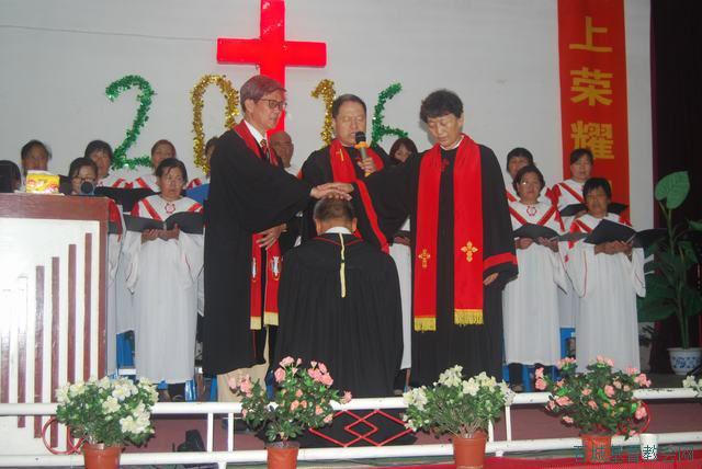 证道结束后,张恩来、牛天平、王晨星三位牧师奉圣父、圣子、圣灵的名为王麦奎长老举行按手礼,愿他以后在教会的工作中,靠着神所赐的恩赐和智慧,牧养神的群羊。王晨星牧师做终礼祷告祷告后,由按立的王麦奎教师祝福,在教堂铜管乐的颂赞声中礼成。最后众位牧师和诗班、圣乐团一起合影留念。