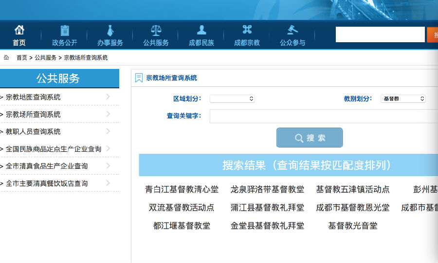 打开成都市民族宗教事务局官方网站,公共服务位于标签栏的第四个,标签栏还包括成都民族、成都宗教等。在公共服务中涵盖宗教地图查询、宗教场所查询、教职人员查询等六大板块。