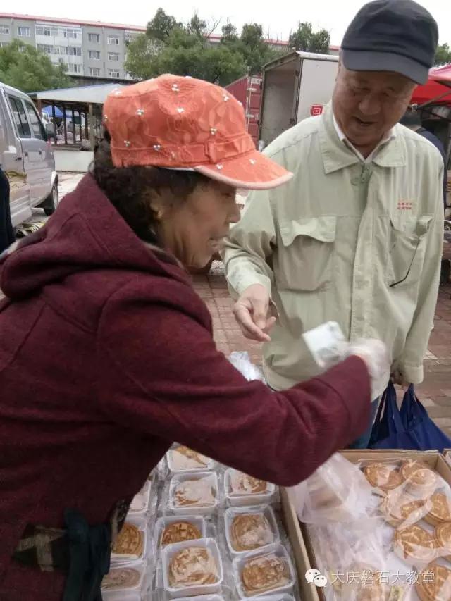 据大庆磐石大教堂微信近期消息,来包月饼的信徒都是义工,金麦隆食品公司为他们安排午餐,卧里屯教会的姊妹义工在集市上出售做好的月饼。