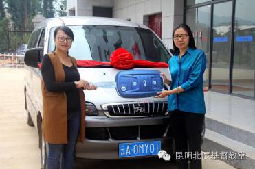 仪式由北辰基督教堂同工穆再云传道主持,李路军牧师为此次赠车仪式献上祷告。随后的赠车仪式中,挪威博尔公司驻昆明办事处负责人蔡迎红女士代表公司捐赠一辆现代商务车给北辰基督教堂,由北辰基督教堂副主任李凤传道代表教会接受车辆钥匙。
