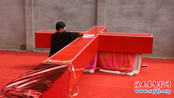 第二部分是荣升十字架仪式。韩城市基督教两会主任、会长程聪智教师跪擦十字架,伴随着乐队吹奏《近主十架歌》,十字架缓缓升起。