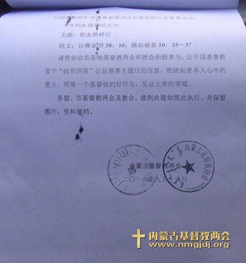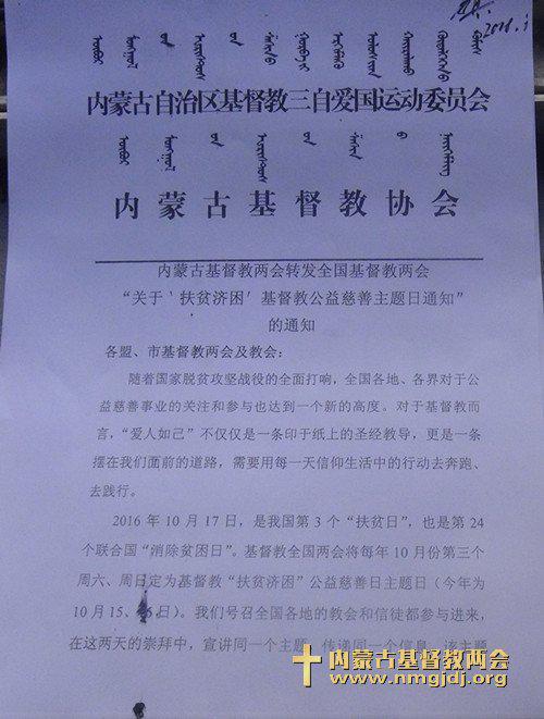9月25日,内蒙古基督教两会网站转发全国基督教两会关于‘扶贫济困’基督教公益慈善主题日通知”文件,响应全国基督教两会宣讲首个“扶贫济困”公益慈善主题日信息的号召。