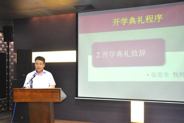 江苏神学院副院长张克全牧师致开学劝勉词。首先张牧师热烈祝贺江苏神学院苏州校区新学期正式开学,并转达了省两会主席张克运牧师的亲切问候和衷心祝贺。之后张牧师提出了三个要求:1、着眼教会需求,使侍奉有深度。不仅为教会,也为现在的侍奉,要着眼教会未来发展点。联系教会的发展进程以及社会的现代化建设,要更好地在教会中运用中国的元素,使神学院学习建立在时代的发展基础上。2、着力专业探索,使研究有广度。要求神学院神学生在专业领域中有自己的研究方向。江苏神学院苏州校区离不开江苏神学院的背景、神学院离不开江苏教会的背景、江苏教会离不开普世教会的背景,所以要求着眼于研究领域的广度,因此彼此要互相学习。3、着手团契生活,使信仰生活有温度。只有彼此经历在温度的生活,才能为未来为在“寒冷”中的人们送去“温度”。真正的“知识”不仅是学院制中得到的而且要从实践中去学习。最后张牧师对帮助神学院的领导表示感谢,勉励神学生与老师教学相长。