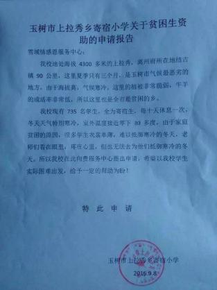 青海玉树市上拉秀乡海拔4300多米,已经下雪。因为家庭贫困的原因,上拉秀乡寄宿小学的许多学生衣裳单薄,没有棉服。该小学现有735名学生,都是寄宿生。