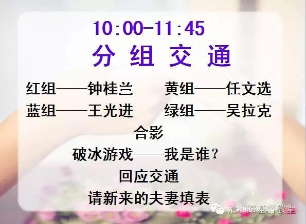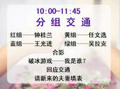 10:00-11:45,夫妻们分成红黄蓝绿四小组进行了沟通交流,大家做了破冰游戏,并请新来的夫妻填表;此后,大家共进午餐,并以期观看视频《家庭改变世界——蒋佩蓉》。