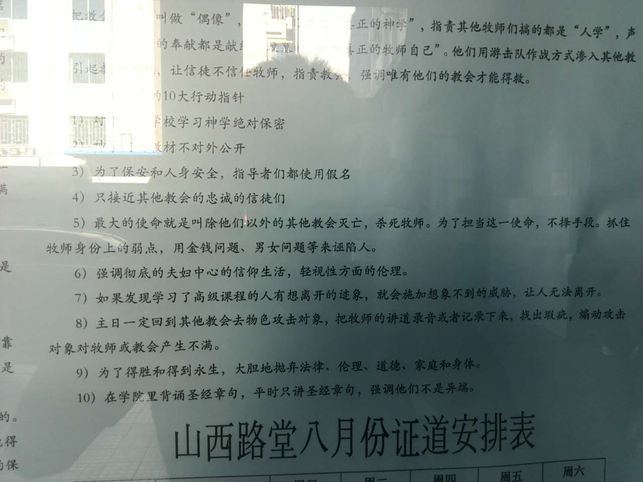 10月19日,天津市基督教两会副主席、副会长毛雅君牧师通过微信曝光了“新天地教会”在天津的“晨星教会”等三个聚会场所,并呼吁天津信众远离异端。