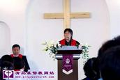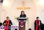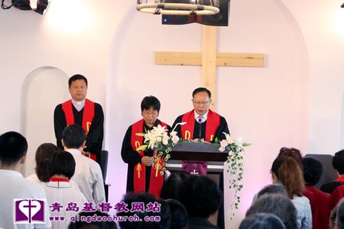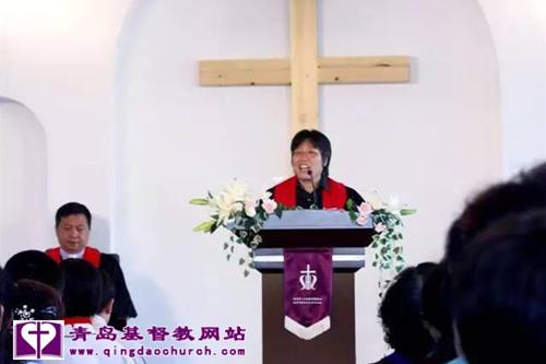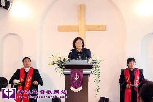 青岛市基督教三自爱国运动委员会主任董美琴牧师代表两会致辞,讲到:一是教会要在时代中见证福音,二是要努力做光做盐荣神益人,三是要坚持爱国爱教的方向不动摇,与时俱进,跟上时代的脚步,努力向上见证主的福音。