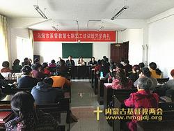 2016年11月7日上午,在乌海市海勃湾区基督教北堂培训楼三楼教室举行开班仪式,乌海市宗教局领导出席开班仪式并做了重要讲话。乌海市基督教两会会长秦秀英长老介绍了此次培训班的筹备情况,并鼓励所有学员努力学习,抓住在圣山上装备的机会,学习好圣经知识回去更好地服事基层教会。此次培训班共有来自乌海三区各堂点40多位学员参加学习,开设课程有《释经学》、《讲道学》、《以西结书》、《路加福音》、《教会管理》、《宗教政策法规》等。