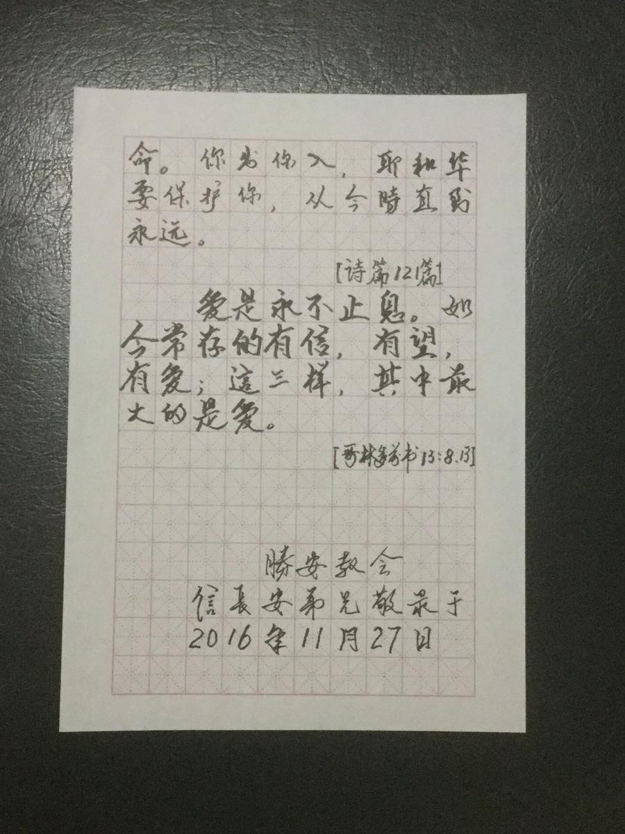3、投稿方式:将抄写的作品拍照,直接发送至“胜安教会”电子邮箱或将原稿邮寄给我们。