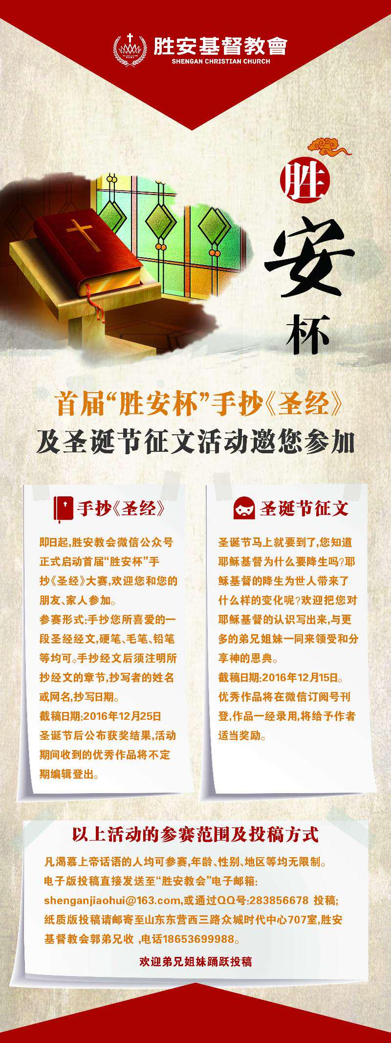 电子版投稿直接发送至“胜安教会”电子邮箱:shenganjiaohui@163.com,或通过QQ号:283856678联系投稿。