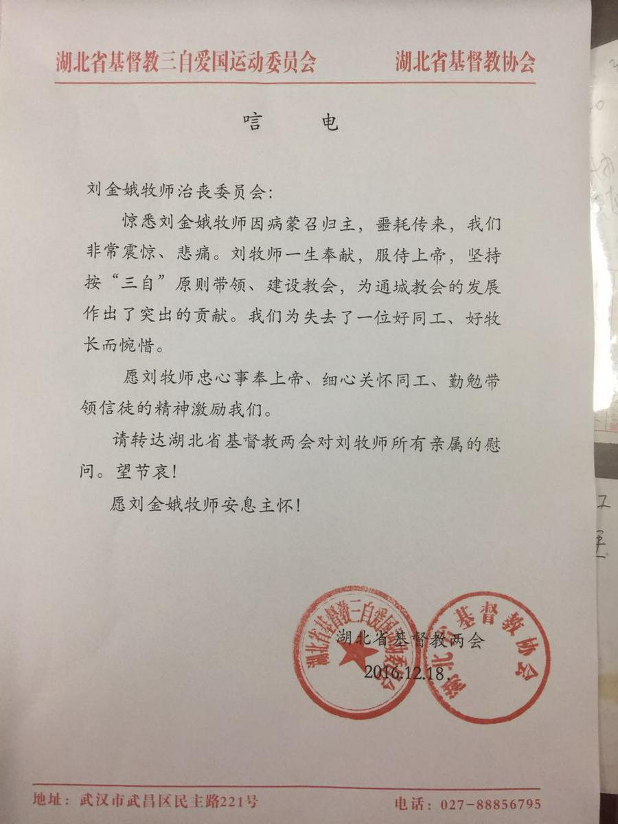 对于刘牧师因病安息,湖北省基督教两会表示:惊悉刘金娥牧师因病蒙召归主,噩耗传来,我们非常震惊、悲痛。刘牧师一生奉献,服侍上帝,坚持按“三自”原则带领、建设教会,为通城教会的发展作出了突出的贡献。“我们为失去了一位好同工、好牧长而惋惜。愿刘牧师忠心事奉上帝、细心关怀同工、勤勉带领信徒的精神激励我们。”唁电中写道。