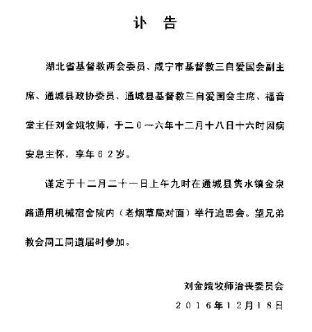 刘金娥治丧委员会于12月18日发布的“讣告”中介绍,刘金娥牧师为湖北省基督教两会委员、咸宁市基督教三自爱国会副主席、通城县政协委员、通城县基督教三自爱国会主席、福音堂主任,她于2016年12月18日16时因病安息主怀,享年62岁。同日,湖北省基督教两会发了“唁电”,表达了对于刘牧师安息主怀的悲痛,并肯定了她对于通城教会发展所做出的贡献。