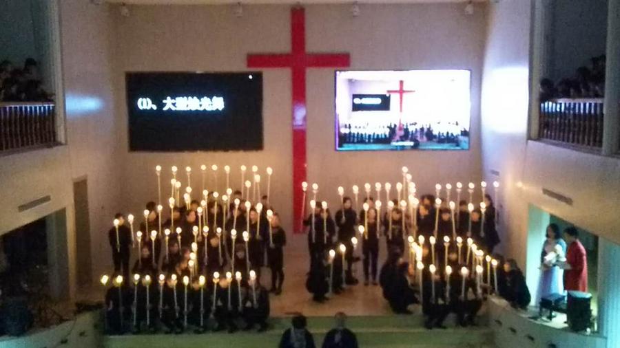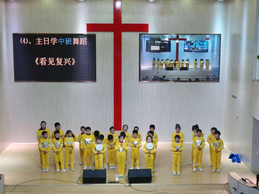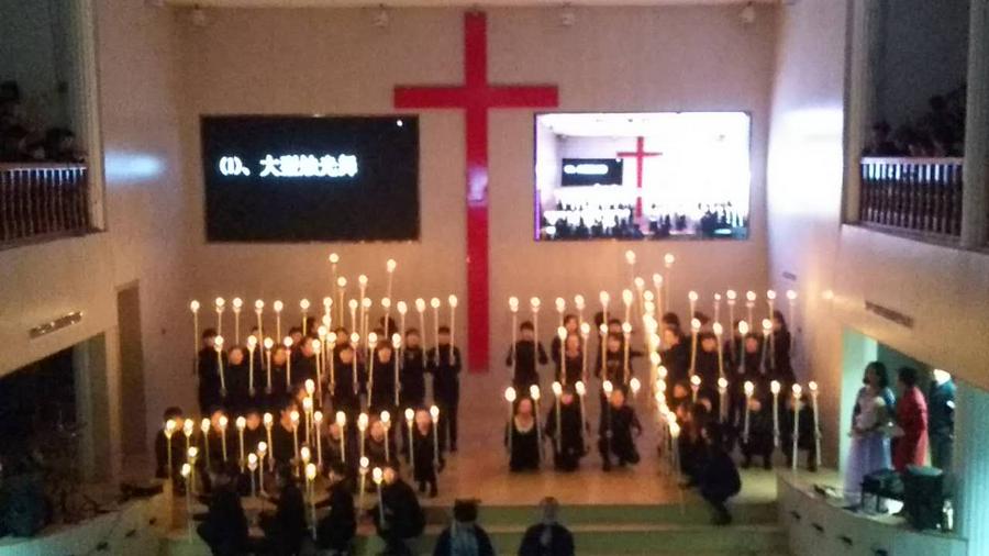首先开场的节目是大型烛光舞,大家手持蜡烛,变换队形,摆出“圣洁”、“羔羊”,场面震撼。主日学的小朋友们分别表演了舞蹈《耶稣到我家》、《耶稣的小宝宝》、《看见复兴》、《天国子民》、《伟大奇妙神》。青年诗班献上舞蹈《使命》,四位弟兄还表演了小品《三句半》。