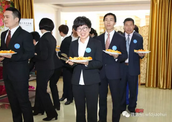 在小组分享环节,教牧、执事会同工们为小组长端水果、点心,倒饮料,服侍这些小组中的服侍者。郑牧师还为每个小组长颁发了勋章。
