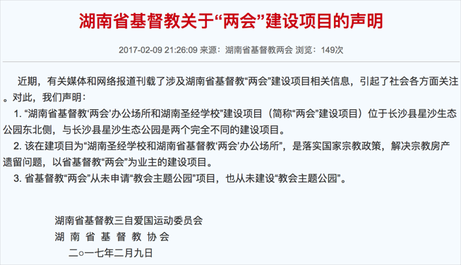 针对近期在网络上出现的有关“中南地区最大教会主题公园”的报道和评论,湖南基督教两会昨晚通过其官网发布了一份回应声明,称湖南省基督教“两会”从未申请“教会主题公园”项目,也从未建设“教会主题公园”。