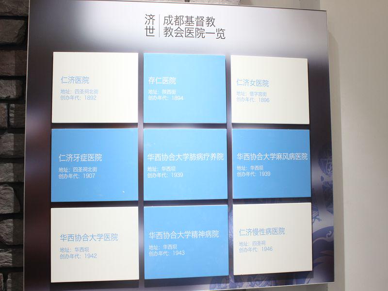 成都基督教会创办了仁济、存仁等教会医院,开办了成都第一家西医院,引进西医西药,传播了现代医学科学,成为中国西部近现代医学发展史上的一个里程碑。