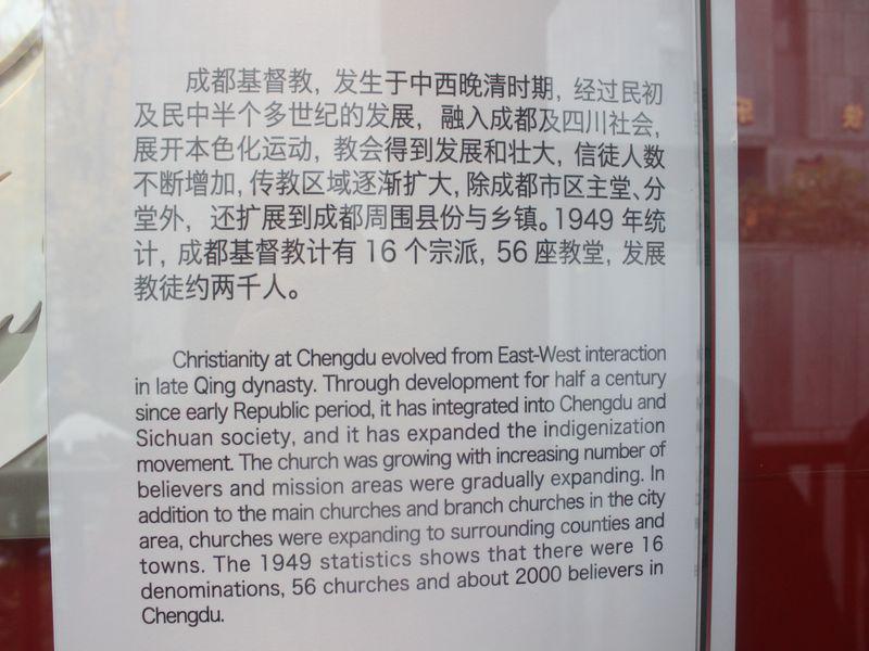 成都的基督教发生于中西晚清时期,经过民初及民中半个多世纪的发展,融入成都及四川社会、开展本色化运动,教会得到发展和壮大,信徒人数不断增加,传教区域逐渐扩大,初成都市区主堂、分堂外,还扩展到成都周围县份与乡镇。1949年统计,成都基督教计有16个宗派,56座教堂,发展信徒约两千人。
