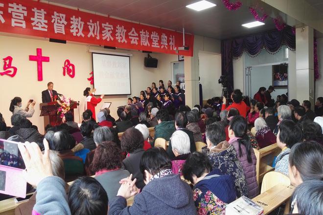 10日上午10:40献堂典礼开始,教会内坐满了人,教会外还有一些人坐着板凳参加。刘家教会负责人刘烈红同工在典礼上做建堂报告,张晓梅牧师代表东营市基督教会及众弟兄姊妹到会祝贺并作劝勉讲话,还有几位牧师、长老做了代祷及致辞。