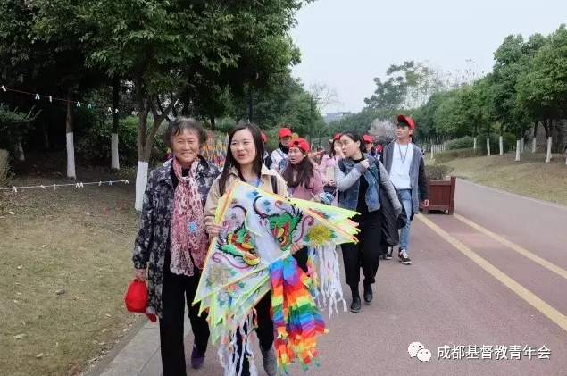 3月18日,成都基督教女青年会的义工们组织社区里的爷爷奶奶们一起放风筝,送出快乐的同时,义工们也收获了快乐。