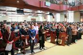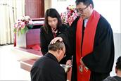 张培生牧师为复活蛋祝圣祷告后,会众依次立队领取;在副堂,为90名信徒洗礼(上午77名和晚上13名),并进行圣餐礼。