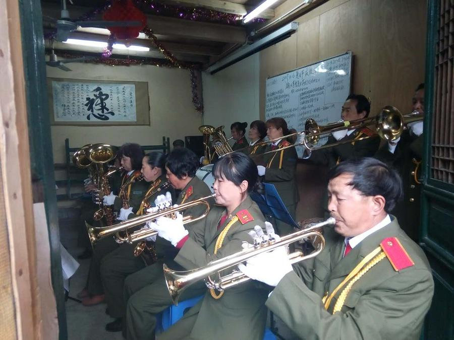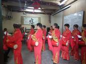 在腰鼓表演中,十余位中老年妇女身着大红服装,鼓棒上拴着红色布条,在红色的腰鼓上欢快的敲着;乐队成员则着一身绿色军装,以各种管乐器来敬拜。