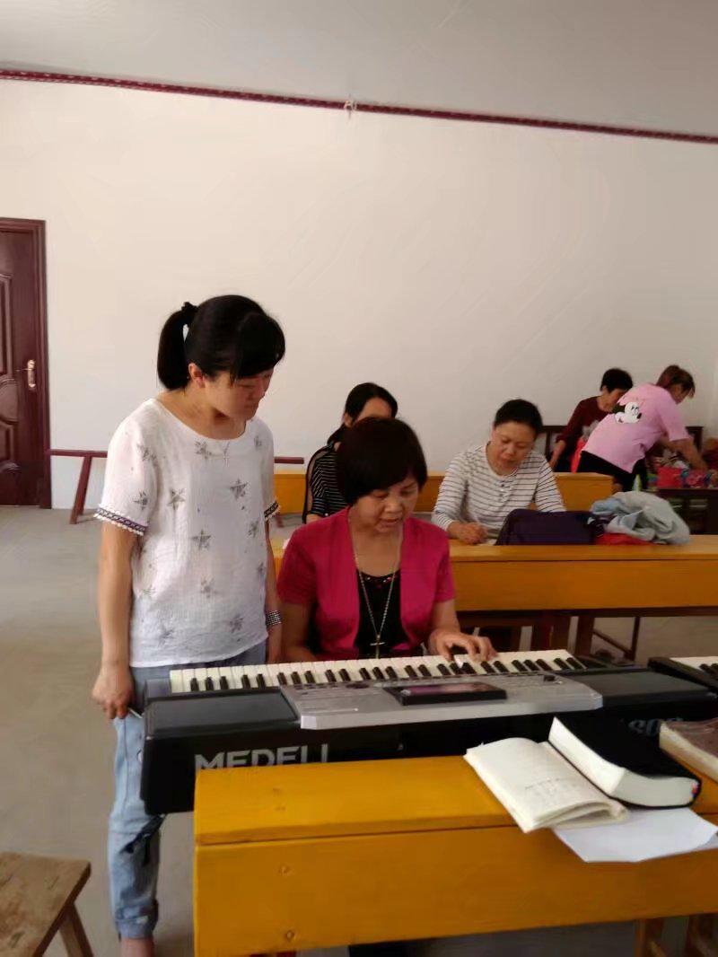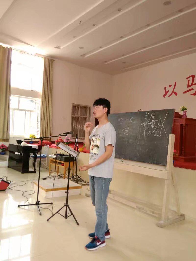 培训班老师是河北省圣经学校的圣乐综合班的大一、大二、大三班的4名学生,借5月节假期之际,前来实习讲课,张康康老师主讲《声乐》与《指挥》,齐海霞老师主讲《基础乐理》,孟小琳老师教《键盘》电子琴和弦伴奏,杜鹏英老师教架子鼓。