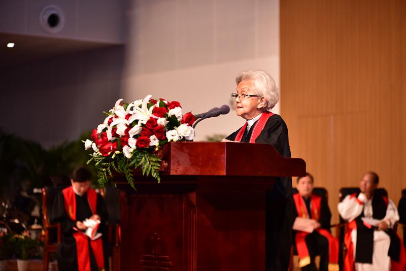 随后,中国基督教协会原会长曹圣洁牧师进行劝勉,她说,“这个礼拜堂不仅是南京江宁区大学城的一个礼拜堂,更要让人看到基督教的诚实、公义与和平,并重视对周围人所应尽的责任。”崇拜最后,梁明牧师、高明牧师、曹仁芳牧师、李云根牧师、薛连喜牧师和吴巍牧师分别宣读了院庆献堂礼文,礼拜即将结束之际,香港邝保罗大主教为会众祝福。