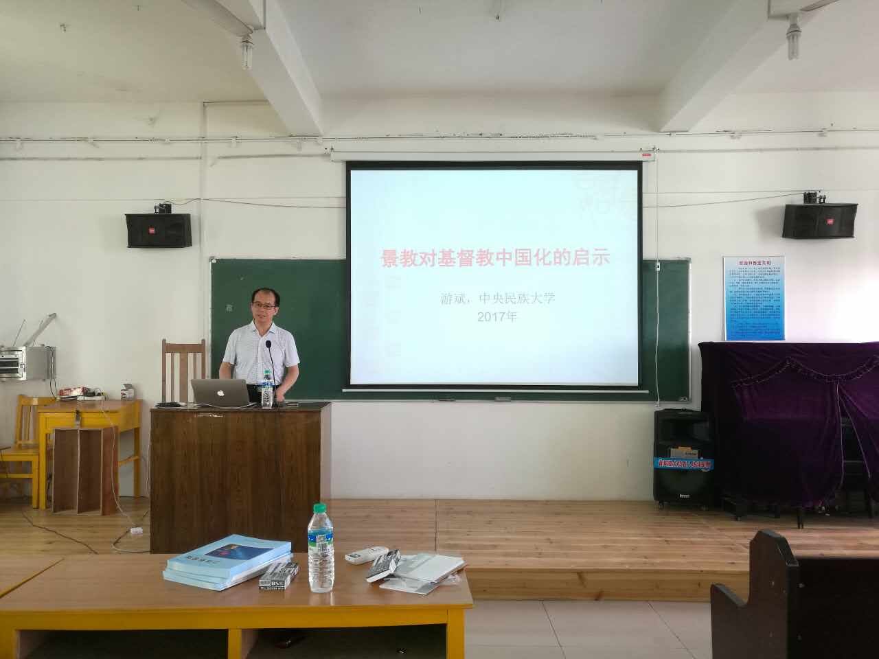 为积极有效地推进江西省基督教中国化事工,提升素质,开拓视野,省基督教两会于2017年6月8-9日假江西圣经学校举办江西省基督教中国化培训班。江西省基督教两会常委、江西圣经学校师生近百人参加培训。中央民族大学游斌教授应邀做“景教对基督教中国化的启示”讲座。