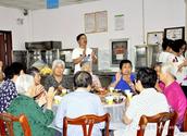 10点多,护工们陆续引导、搀扶老人们到座位上坐好,并为老人们戴上生日帽。老人们围坐在桌旁高兴地等待宴会开始。郑牧师向每桌老人亲切问候,并与老人们开心畅谈。