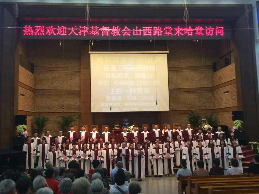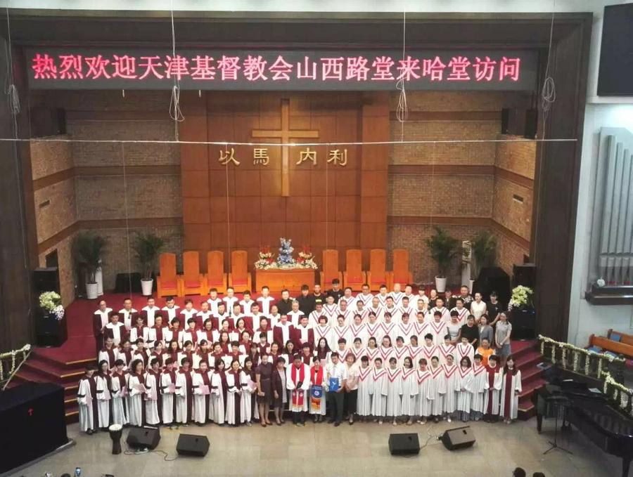 8月12日下午4点,哈尔滨哈利路亚教会全体教牧同工在主任牧师吕德志牧师的组织下,迎来了天津基督教会山西路堂主任牧师毛雅君牧师及全体诗班成员,近60人。