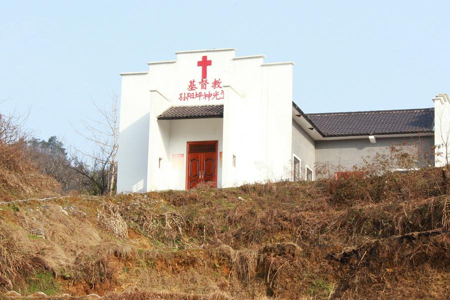“孙阳坪教会到了!”随着牧者的指引,看到了孙阳坪教堂的全貌:她被独自建立在一个山坡上,首先映入眼帘的是教堂白色的正面,正门上方有黑色瓦檐,瓦檐上方的墙面上是红色十字架和“基督教孙阳坪神光堂”字样。教堂的主体风格与当地居民住房相似。