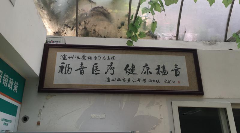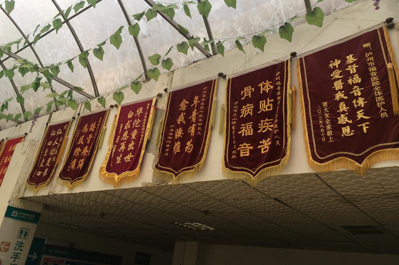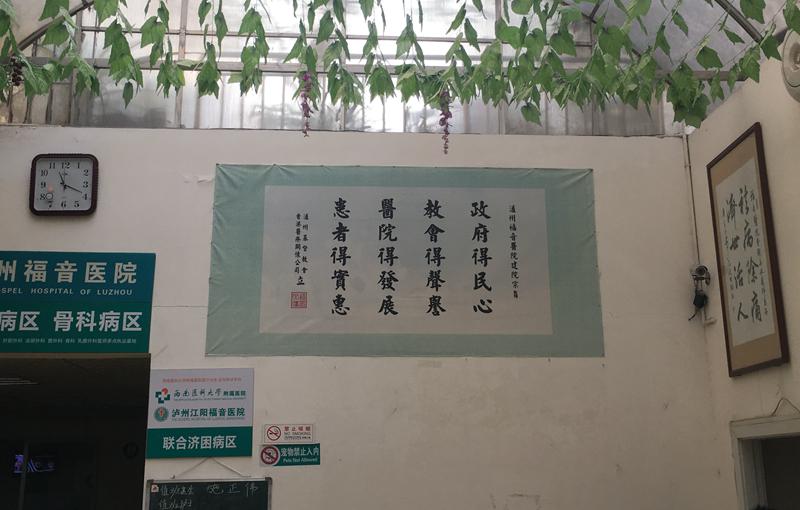 医院,是治病救人的地方,红十字标志提醒着这一切。泸州福音医院坐落于泸州市江阳区濂溪路,在路口右转处,医院前有绿树。“福音医院”几个字印在蓝色底板上,两侧挂着医院的招牌,上方写着“慢性病专科 椎间盘专科、骨关节……”,一排字显出了医院的特色。医院两层楼高,走进去之后通向不同科室。