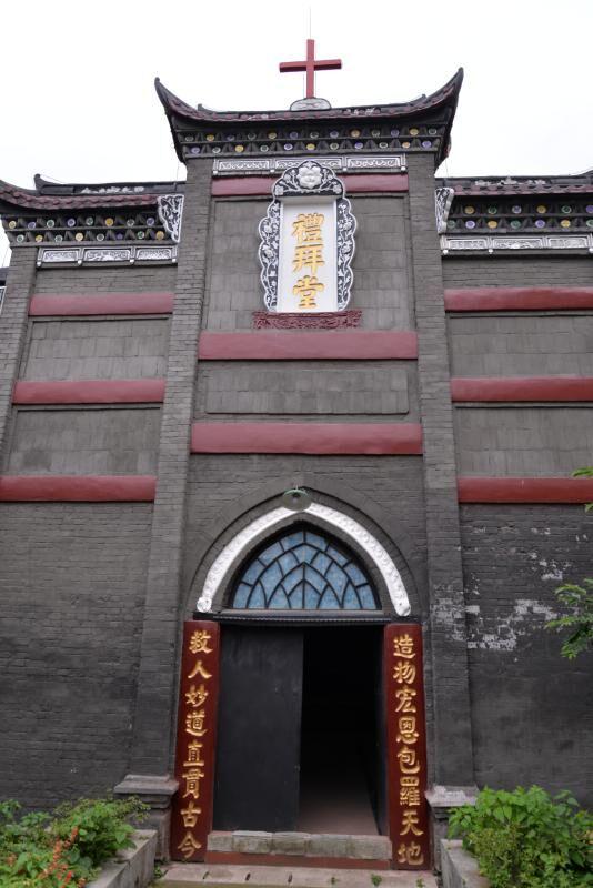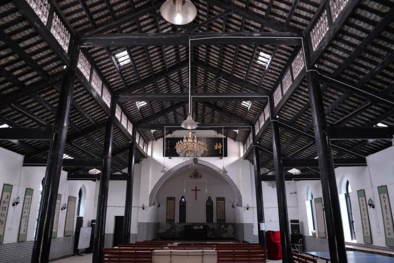 走进一看,教堂的主体结构是中国特色的“穿窦式”木制结构,教堂门上方是典型的中式牌坊,教堂的墙体配有彩色玻璃镶嵌的花窗。教堂圣台为中式祭坛,圣台前沿的圆弧为西式结构;在教堂内部,还有8根布局和谐的黑色大圆柱,那是红椿木做的。这从侧面反映了基督教传入中国后,入乡随俗的本土化倾向。