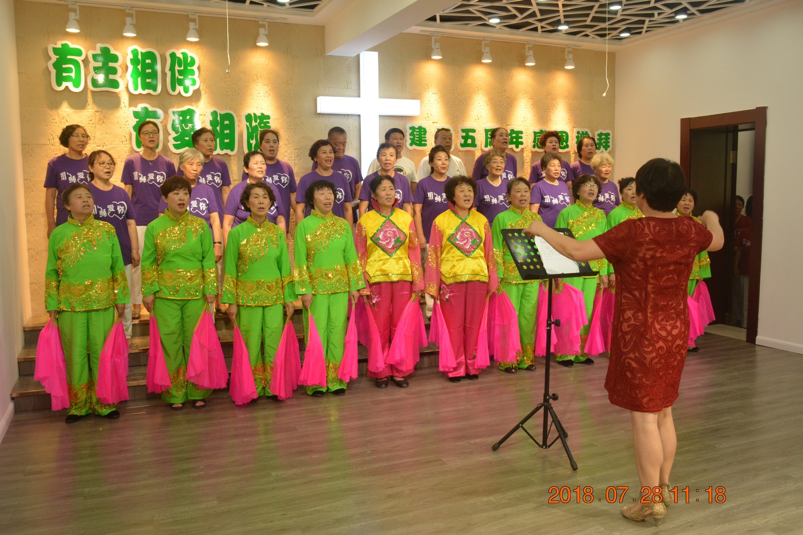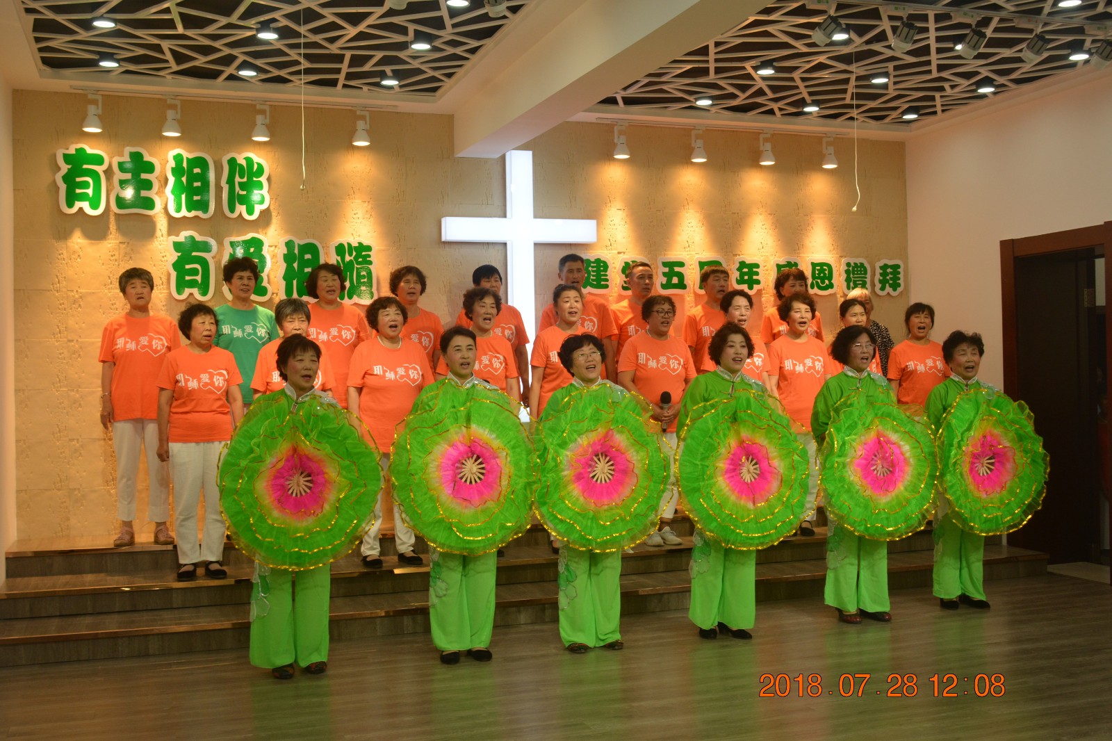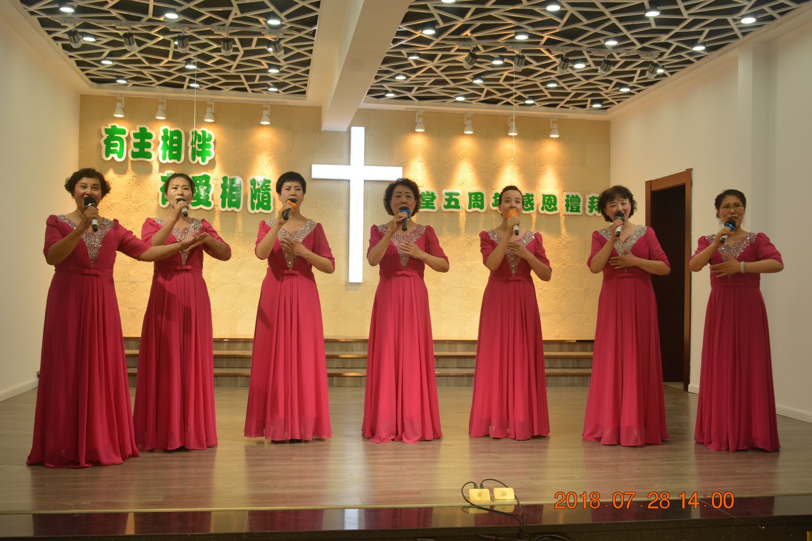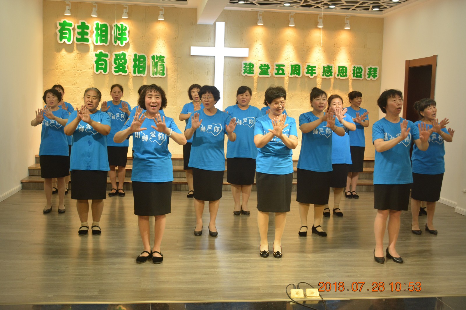 7月28日上午,在进行了半个小时左右的敬拜赞美后,8:20,海口路教会建堂5周年庆典正式开始。圣诗班献唱的《圣殿的荣耀》传递出盼望的信息:“银子是我的,金子是我的,这殿后来的荣耀必大过先前的荣耀。在这地方,我必赐平安。”