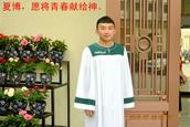 夏博,来自于一个基督家庭,他的奶奶就是一位信徒。他从小就在教会服侍,现在是海口路教会的青年团契会长,负责教会的文宣、接待、赞美、探视、培训等各项事工。本来夏博大学已经毕业,而且有了两年的工作经历。但为了更好地进深,夏博放弃了工作,报考了中国基督教最高学府的南京金陵协和神学院,并被录取,8月末他就要去读神学了。我们为夏博祝福,也为背后支持他明智的家长点赞!我们相信:愿将青春年华献给神的夏博一定会成为一个神所喜悦的圣徒!