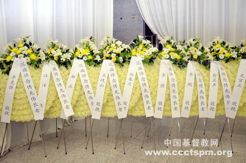 殡仪馆大厅布置得庄严肃穆,傅先伟长老的遗体安放在鲜花丛中。正前方墙的正中央高高悬挂着傅先伟长老的遗像,相片中,傅先伟长老眉目慈祥、面带微笑,一双祈祷的手紧紧相握。遗像的正上方悬挂“傅先伟长老安息主怀”横幅,左侧“忠于国家坚持教会中国化方向无比勉勤”,右侧“侍奉教会推进神学思想之建设不遗余力”,挽联是对傅长老一生最好的注解。