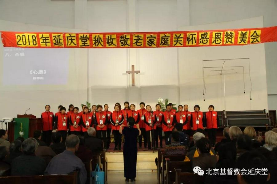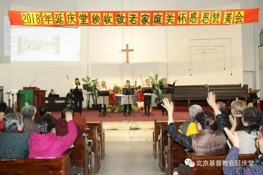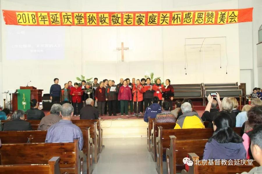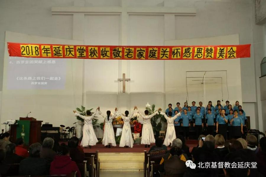 当70岁以上延庆区老年朋友站满台前,他们胸配红花,感动地接受敬老礼物,领受神爱祝福,当西罗亚团契《这条路上我们一起走》的赞美声响起,当赞美队深情咏唱《主赐福如春雨》《全然向你》,当教牧的证道《感恩的节期》传达至会众的耳鼓心灵,主的恩光与荣耀便彰显在这里了……