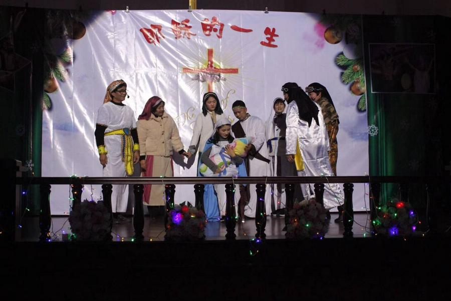 平安夜的活动以圣剧表演的形式,简短讲述了耶稣的一生。也用心准备了丰富多彩的节目来欢庆圣诞。有大提琴协奏曲《马利亚之歌》,在动人的琴声中,我们仿佛听到了玛利亚说:“我的心尊主为大”。朗诵剧《按才受托》,小品《新妇的祷告》;短剧《通行证》;舞蹈《打开天窗》。