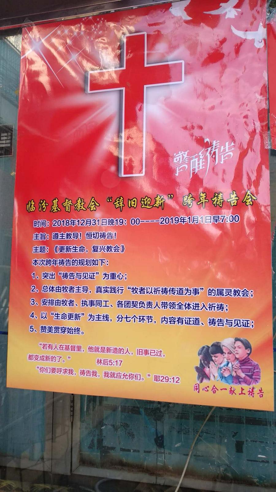 “遵主教导,恒切祷告”,圣诞期间,一幅有关举办“2019年辞旧迎新跨年祷告会”的招贴画张贴在临汾市尧都区基督教会城区堂公示橱窗栏内,吸引了信众关注的目光。这意味着在辞旧迎新之际,一场丰富的属灵筵席即将摆上,必将使教会、牧者及信众大得裨益。