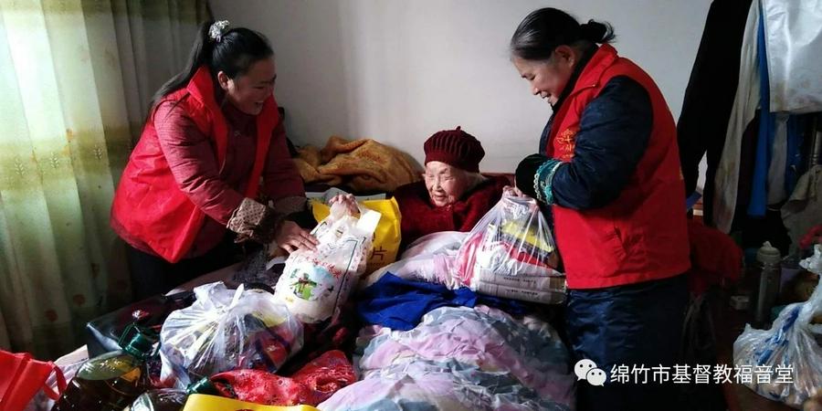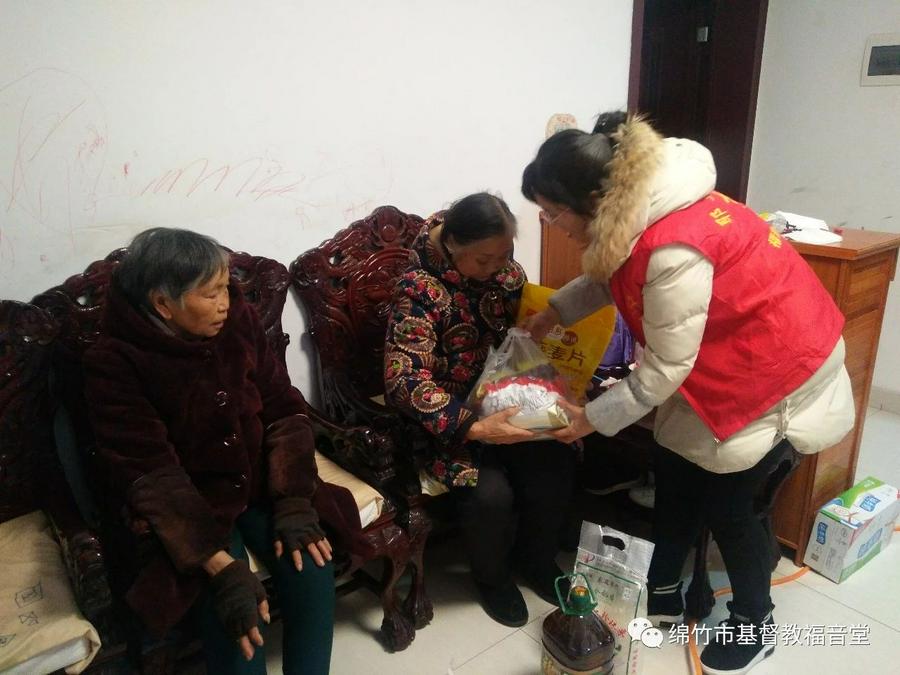 绵竹市福音堂关注慈善、关爱老人,弟兄姊妹入户探访慰问年迈、疾患老人,愿尽微薄之力关爱身边的老人,带去主爱的温暖,带去盛装丰富食品的暖心包,陪老人唱诗歌、祷告、拉家常。