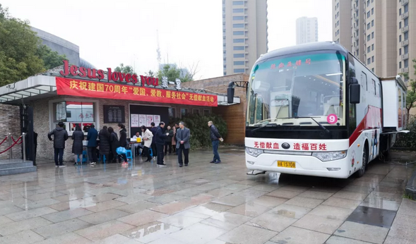 2019年3月9日(礼拜六)上午,杭州市崇一堂在正门口小广场举行“庆祝建国70周年‘爱国、爱教、服务社会’无偿献血活动”。有72位弟兄姐妹踊跃参加无偿献血活动,以实际行动弘扬基督的大爱,做光做盐,庆祝祖国70周年。