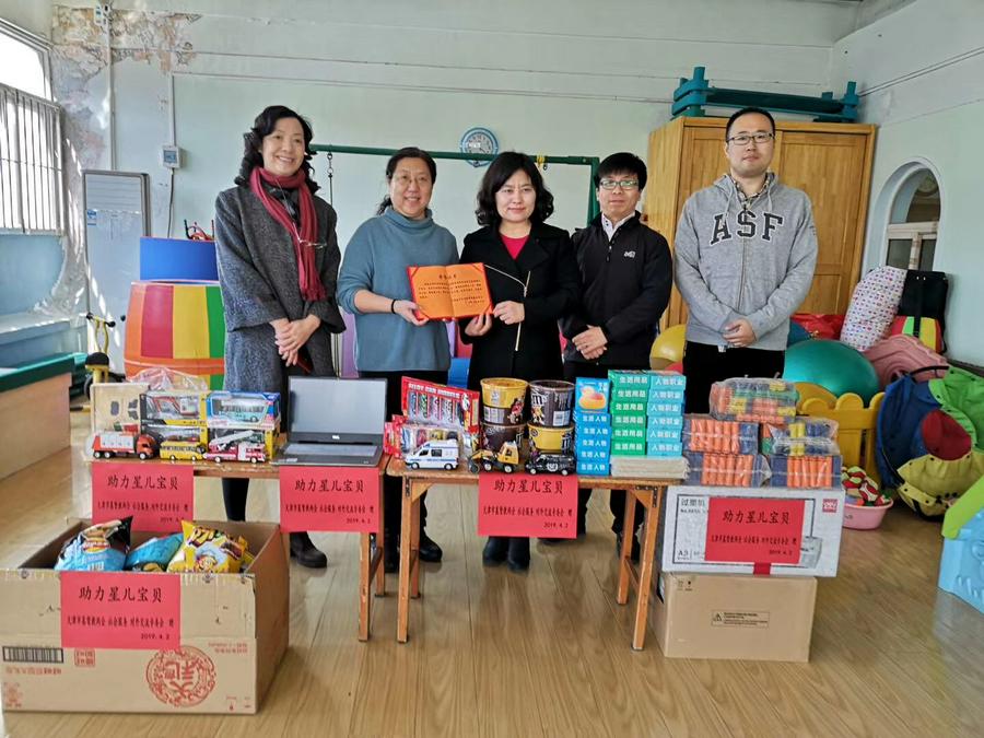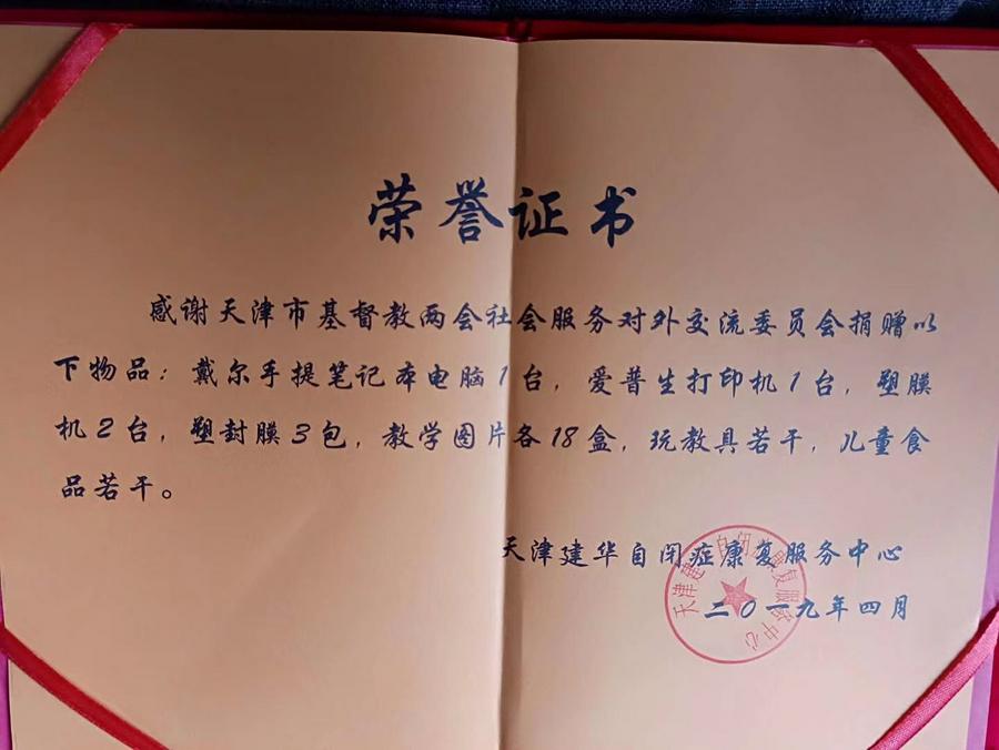 同工们给康复中心送去了笔记本电脑、打印机、塑膜机、教学用具、儿童食品等礼物,康复中心回赠了“荣誉证书”以示感谢。